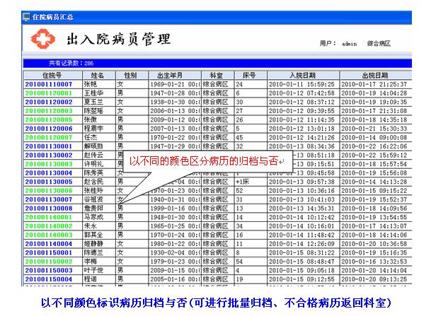 在院病歷查詢/入院記錄查詢/出入院病員管理(以不同顏色分別標識在院、出院未歸檔、已完成歸檔、不合格病歷等)/出院病歷統(tǒng)計/歷史病歷查詢/ICD-10編碼查詢