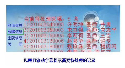 打開消息提醒,出入院登記處完成病員入院登記后對應的病區(qū)即提示此信息;待處理醫(yī)囑:醫(yī)師為病員下達醫(yī)囑后即提示等待處理;醫(yī)師下達出院醫(yī)囑后提示待出院記錄,以醒目滾動字幕方式提醒